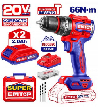 Taladro percutor atornillador inalámbrico 20v 66nm Brushless super Emtop